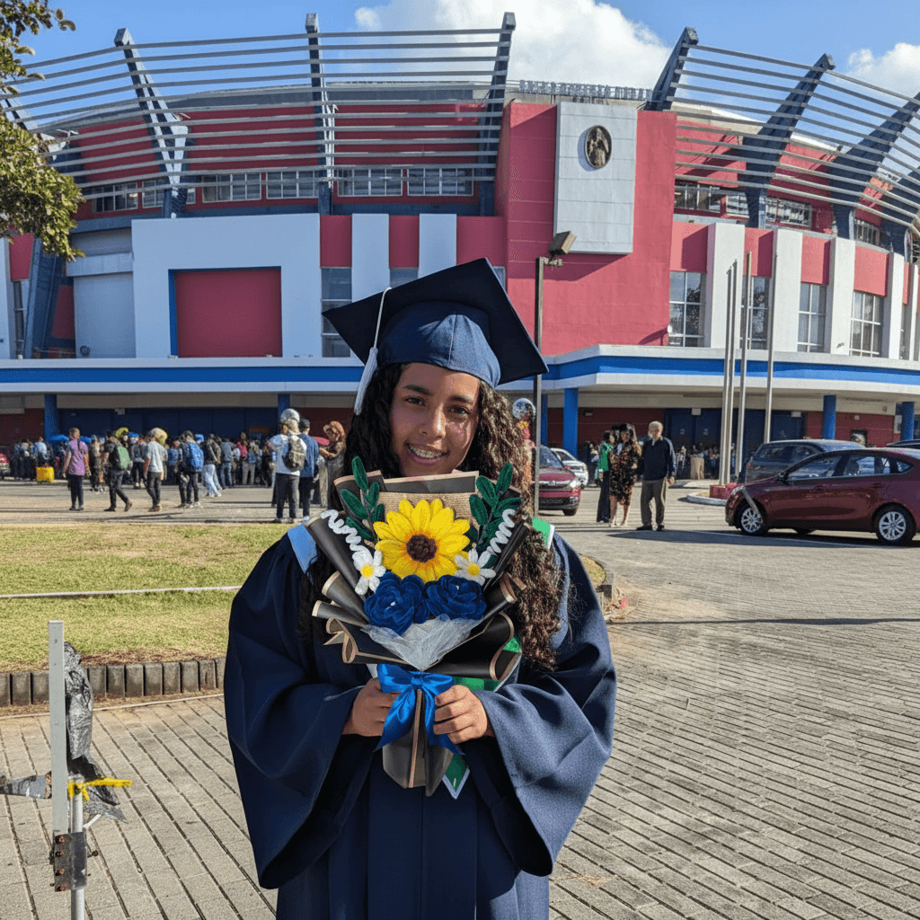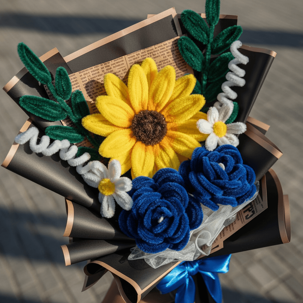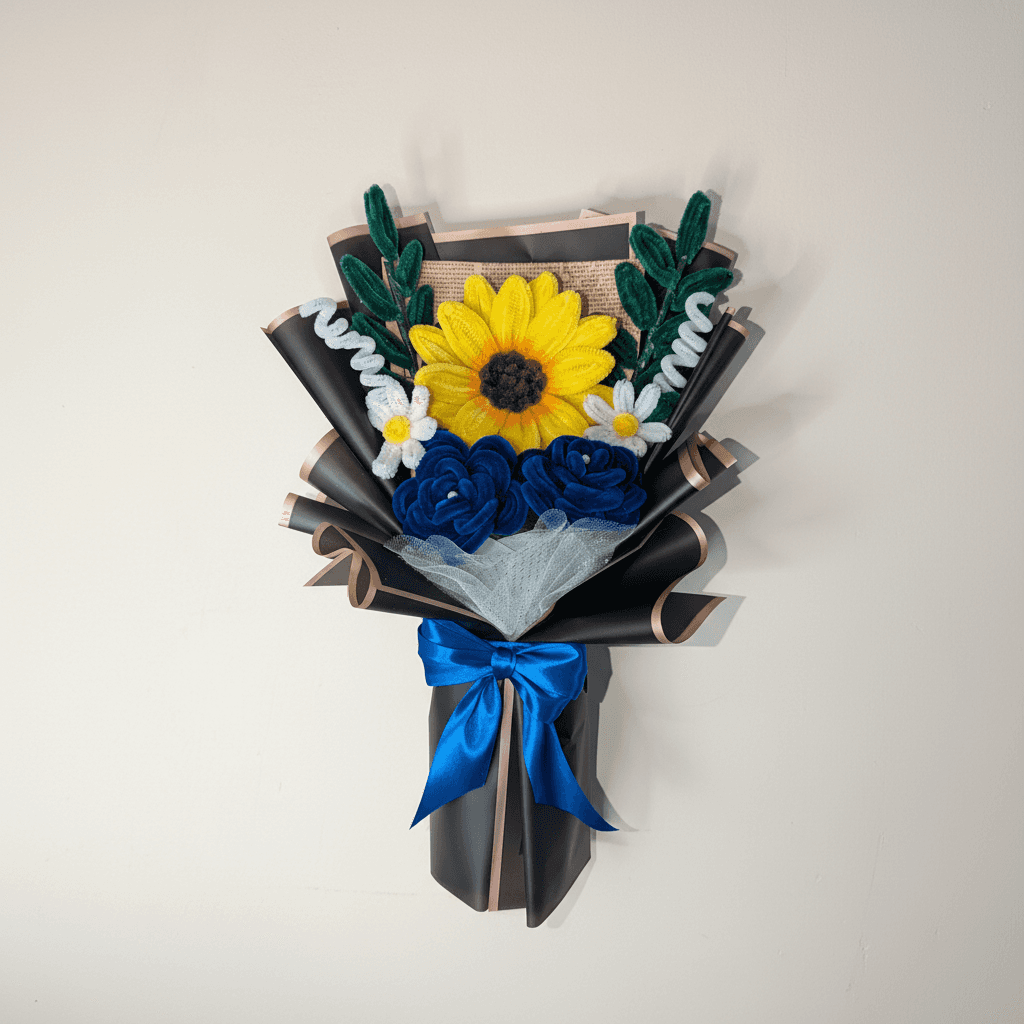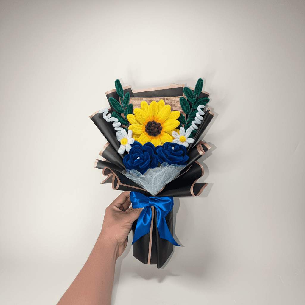 Un ramo artesanal con un girasol protagonista y flores azules, pensado para celebrar una graduación con un detalle que no se marchita. ✨ Composición 1 girasol amarillo (flor principal). Flores azules (estilo rosa). Margaritas pequeñas blancas. Hojas verdes decorativas. 🎓 Ideal para Graduaciones, felicitaciones y fotos de recuerdo. 📌 Nota Cada ramo es hecho a mano, por lo que pueden existir pequeñas variaciones que lo hacen único.