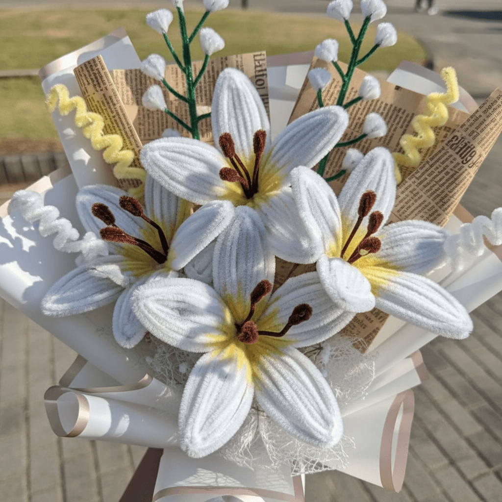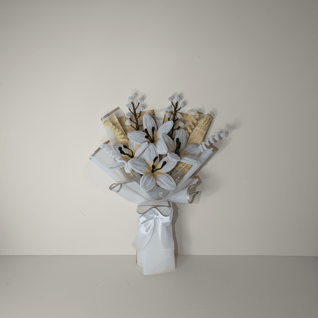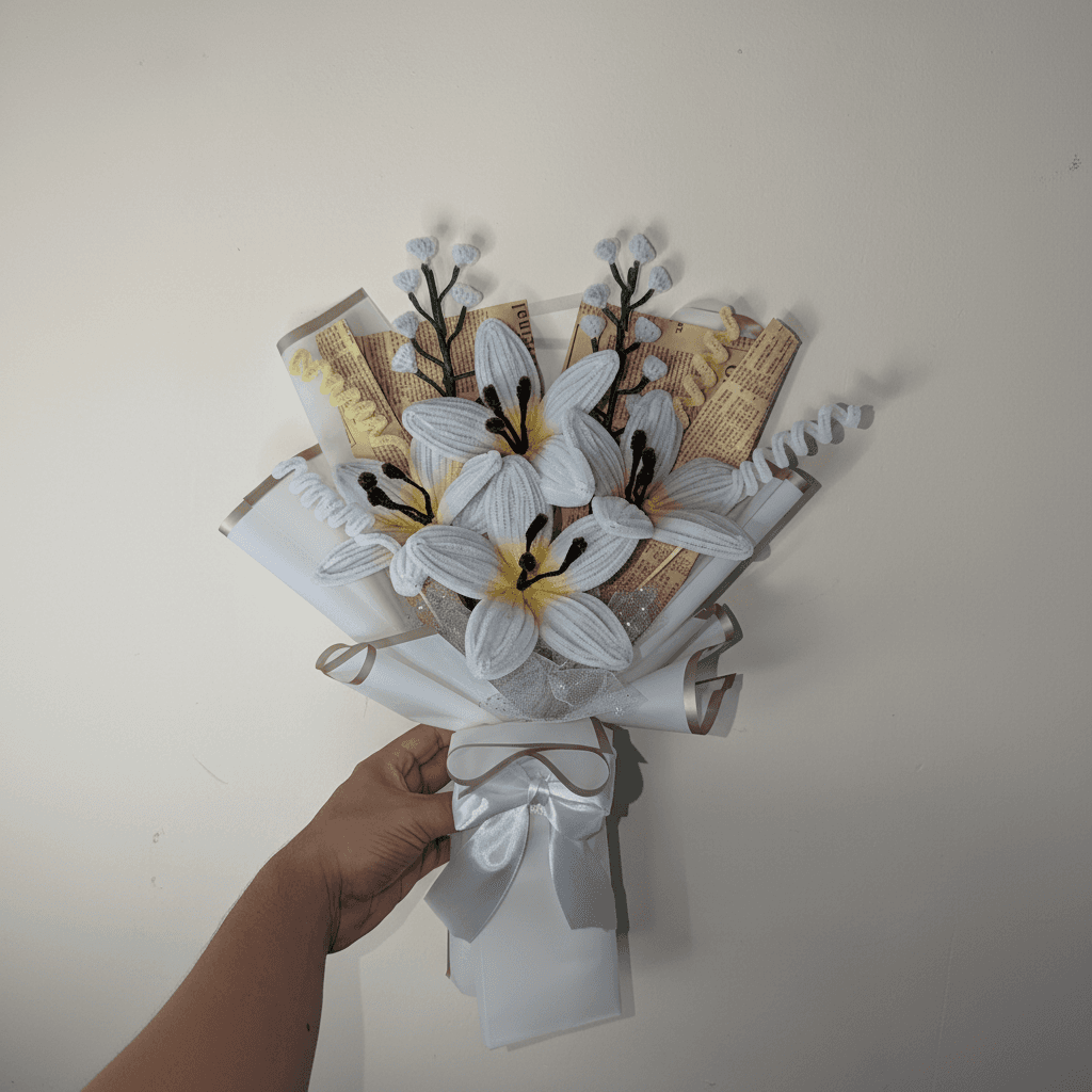 Un ramo artesanal elegante con lirios blancos, ideal para graduación: un recuerdo especial que dura años y acompaña ese gran logro. ✨ Composición Lirios blancos (flor principal). Detalles de ramitas/botones blancos. Envoltura clara con lazo blanco. 🎓 Ideal para Graduaciones, reconocimientos y regalos sobrios. 📌 Nota Cada ramo es hecho a mano, por lo que pueden existir pequeñas variaciones que lo hacen único.